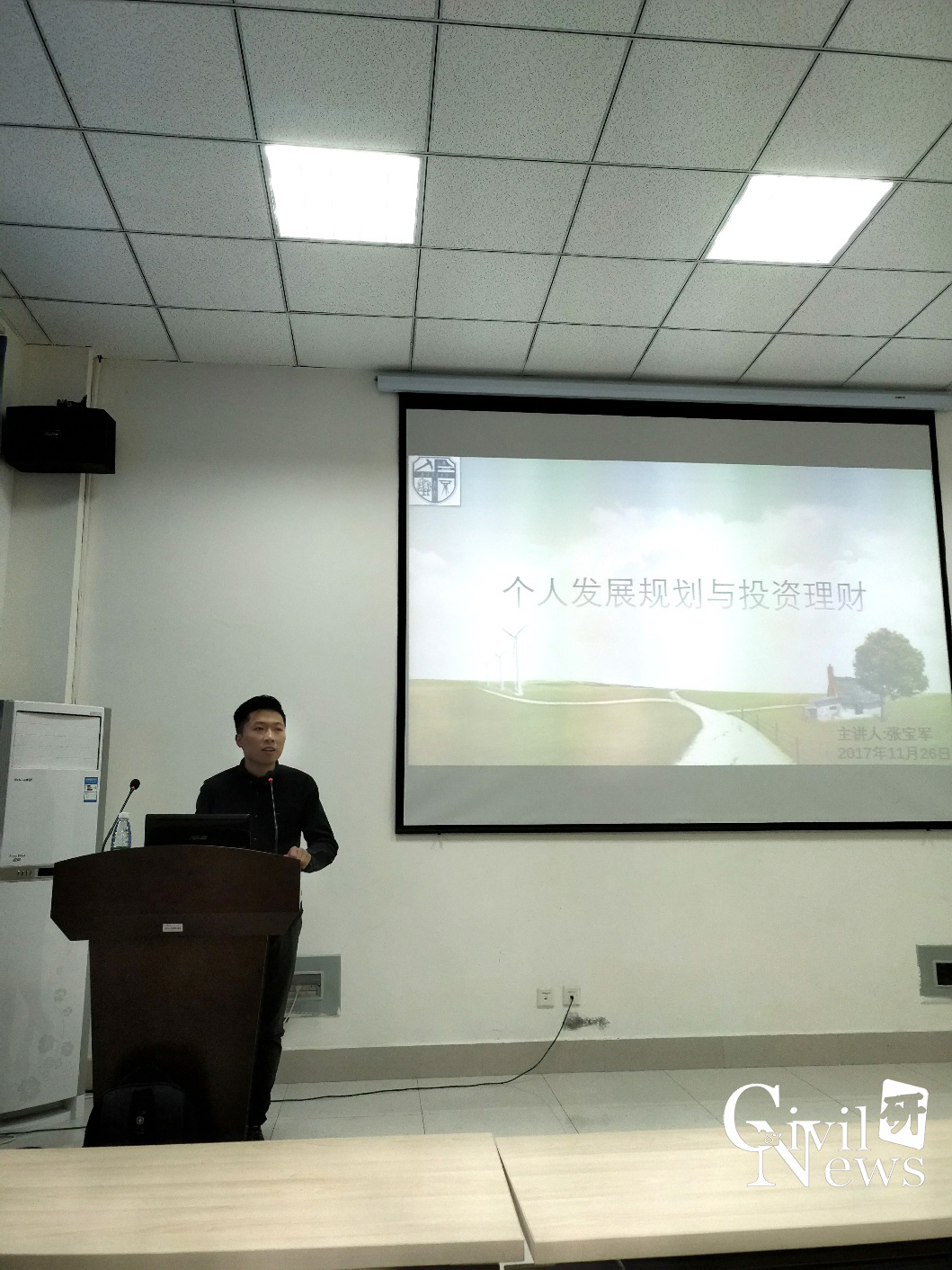 张老师先做了自我介绍,并向大家讲述了此次讲座对同学们在未来学习、生活、工作中的指导性作用。张老师在此后两个多小时的讲座中,先后讲解了思想的价值、个人发展规划、投资理财、未来储备和具体案例等五个方面的内容。