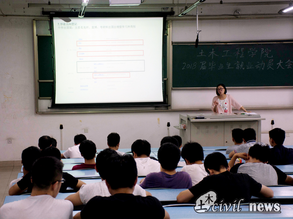 7月7日下午七点,在X2218教室举行了jn江南2018届毕业生就业动员大会。本次动员大会由黄雪娇辅导员主讲,向2018届毕业生介绍了以往土木员工毕业后的发展情况以及就业网的使用要点。