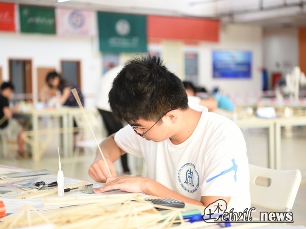 本次共有14支队伍,分别来自不同的高校。在不少队伍中,都有女生的身影出现。所有参赛选手都聚精会神地切割竹皮,小心翼翼地为模型添上精致的零件。在制作过程中,记者注意到,第十四组选手别出心裁地将竹编裁成细条之后,再搓成绳子运用到模型上,可谓是独具匠心。工作人员在比赛场地的后方为选手们提供了一段6.5米的水管,以便调试使用。四小时后,上午阶段的模型制作暂时中止,选手及工作人员前往风华苑用餐,稍作休息后又回到场地继续制作模型。