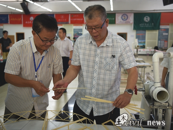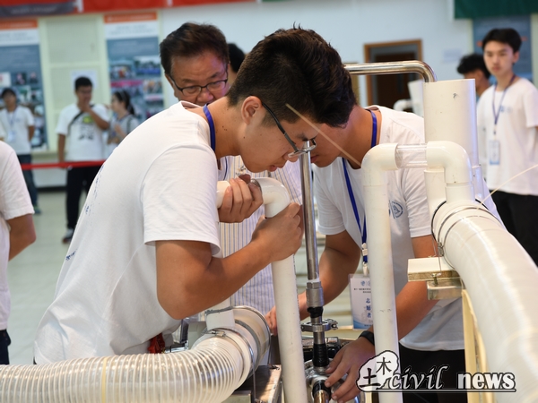 18点整,模型加载阶段开始,场地的气氛变得凝重。主持人先介绍了今天到场评委即评委专家委员会成员,在由非参赛人员进行了预加载示范后模型加载正式开始。加载时,选手先自行搬运模型到加载台,计时完成模型的组装,在组委会提供的两个水管中自行选择一个水管进行模型组装。组装完成后,选手进行口头答辩。然后开始加载,输水完毕后静载30s再自行排水。每组答辩时,评委老师都对其优劣进行了点评,所有参赛选手们受益匪浅。