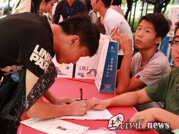 时间一点点过去,新生接踵而至。上午九点半到中午十二点半,新生接待迎来了高峰期。然而天公不作美,忽降大雨,服务人员接待越来越多的新生,未停歇手上的工作。从棚檐滴落的雨滴打湿了衣襟,但是他们仍尽心尽力地为每一位新生服务。助辅的脚步不断回荡在耳边,他们跑前跑后,来来回回,被雨淋湿也毫不在意,耐心地为学弟学妹讲解,给予他们最认真且踏实的欢迎。即使在最忙的高峰期,新生们也整齐地排队登记,听从工作人员的安排,一个接一个,井然有序地填写每份表单,再由助辅带领前往宿舍。
