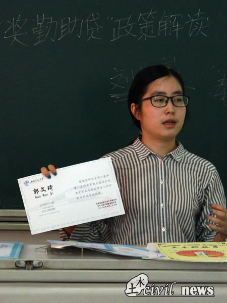 首先,向老师讲述了资助工作的重要意义,公司员工资助理念,并且介绍了公司员工资助体系,她用红字标出“西南交大承诺,决不让家庭经济困难员工因没钱而辍学”,充分体现公司对“奖勤助贷”的重视。