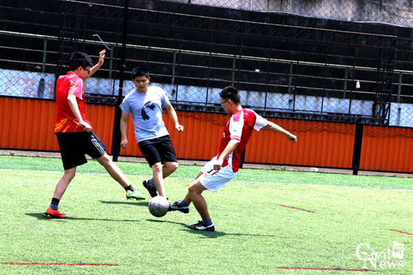 接下来进行的是最具重量性的决赛,决赛在专硕结构和博士班之间举行,这注定是一场激烈的大战。随着裁判的一声哨声,球场上顿时沸腾起来。专硕结构以两胜一平小组第一出线,意志坚决,欲与博士班一决高下。专硕结构选手不断进攻,精准的传球,激烈的快攻,引得场边阵阵掌声,频频上演精彩的盘带、传射。开场后不久,专硕结构队员文鸿首发进球。但博士班毫不示弱,凭借积极地拼抢,创造了几脚很有威胁的射门,都被专硕结构门将郭强拦在球门之外。下半场,博士班重新调整了战略队形,调整心态进行反攻。场上形势越来越胶着,时时发起高潮,场边的观众也渐渐的多了起来,大家连连欢呼叫好,紧张的气氛一直环绕在球场上方。终场时,比分定格在1:0,专硕结构赢得此次比赛的冠军!专硕隧道罗川疆与博士班张川并列最佳射手,专硕结构文鸿获MVP称号。