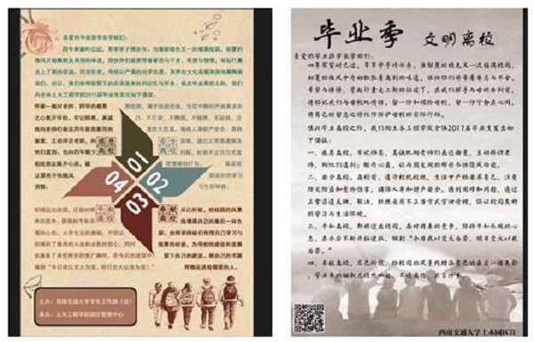 其次,在6.1日和6.2日中午以及下午在天佑斋19、20号楼下设立宣传点,向毕业生宣传文明离校的活动,发放文明离校温馨提示以及交大纪念明信片,温馨提示以“安全离校”“感恩离校”“平和离校”“奉献离校”四大板块倡导毕业生在离校之际能够站好最后一班岗,充分展示交大人的风采,交大纪念明信片现场发放,毕业生留下联系方式,后有专人入寝收取,明信片用来毕业生给同学,朋友,老师,学弟学妹写自己的祝福语或者是想说却一直未说的话,后由园区的工作人员帮忙送到对方手中。
