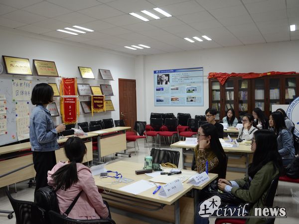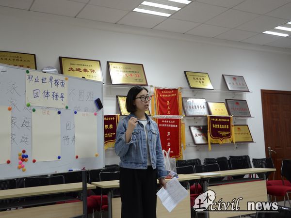 6点整辅导课堂正式开始,10位同学共被分为3个小组,组员之间互相作自我介绍。而后,全部同学制作了包含有未来拟从事职业信息的名牌。黄雪娇老师依次浏览了同学们的名牌之后,总结道:“对于未来职业,我们可以拓宽思路,未必要局限于土木行业,这也正是我们今天进行女性职业世界探索的目的。”