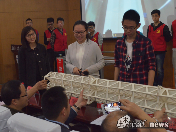 第一组制作的是拱形桥。选手进行了慷慨激昂的答辩,并且第一轮加载成功,但遗憾的是在第二次加载6公斤时,桥梁横梁损坏导致了失败。评委老师针对选手的答辩,对拱形桥的定义进行了具体的讲解和指导,并对他们的桥梁结构提出了修改意见。上午的参赛组很多都是大二,经历过去年的比赛的经验,很多组别都两次加载成功。其中不乏许多精彩作品,如最大挠度值在0.8左右的,采用了新式桥型的,其中的不乏评委十分喜欢,获得合影留念机会的。在最后一组加载完毕后,上午的比赛告一段落。