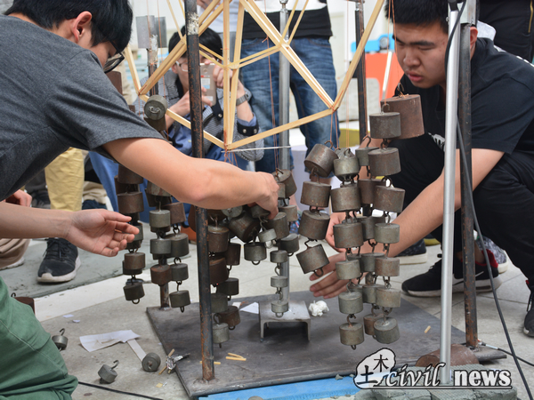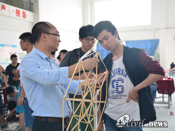 本次决赛分为答辩、第一轮加载、第二轮加载三个环节。在答辩环节中,每个小组按照要求,由一名同学用PPT对本组参赛作品进行全面介绍,而其他两名同则向评委老师展示实体模型。参赛的同学们通过查阅资料、受力分析和用软件分析模型性能等方法,最终确定模型的设计,并在现场为大家讲解设计和制作的过程。评审老师走入场地,认真地观察模型,做出点评,并根据实际情况提出建议。
