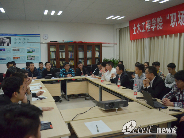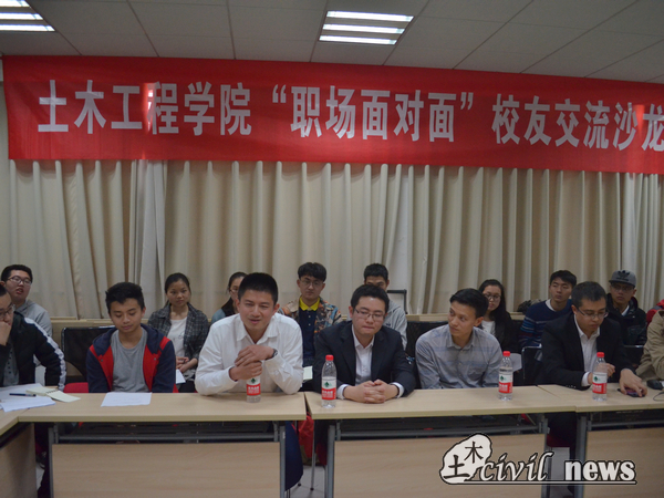 而后,刘力豪学长探讨了有关职业发展道路方向的问题。刘学长将土木的工作分为三大类:施工、设计以及咨询。他说:“无论是选专业方向,还是未来工作,切记不要随大流。要认清自己适合干什么、喜欢干什么。”然后,学长又提到了在公司最重要的两点品质——主动性和责任心,“在完成自己任务的情况下,能做便多做,才能快速地成长”,学长如是说道。在经验方面,学长建议学好办公软件以及土木的工程软件,在大学阶段一定要好好锻炼自己的文字和口头表达能力。对于职业发展道路偏差的修正,学长建议要及时反思,必要时要进行目标的修正,遇到低谷时也不要沮丧,慢慢积累可能会迎来薄发。“记住:坚持住,沉下去,浮上来”,刘学长嘱咐。
