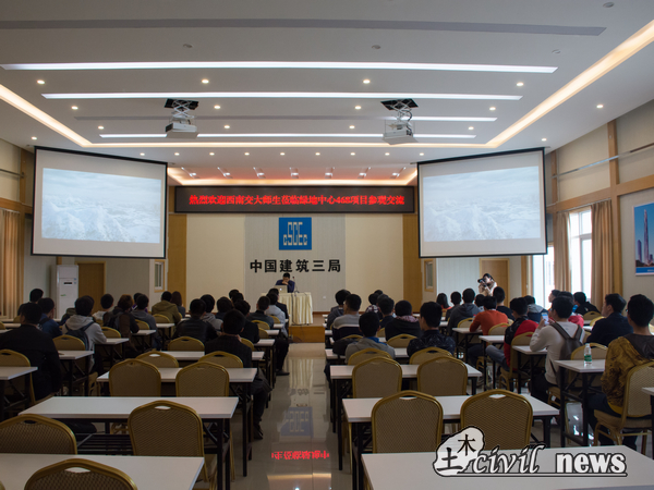 下午两点整,开始了交大师生同中建三局进行的面对面交流会。出席这次交流会的有:中建三局成都公司党委副书记赵德福、人力资源部经理单满意、交大师兄郭伟郭经理、陈晨陈秘书,西南交大土木学院副书记李锦红、就业指导中心指导老师黄雪娇。首先,中建三局用三个短视频,向交大师生展现了他们公司温馨、欢快的企业氛围。然后,交大的师兄与在校的本科生分享他们的工作经历。