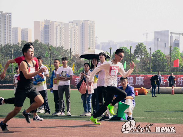 趣味运动会“毛毛虫竞速”在体育场的草坪中央进行,各个学院均有四人参加。比赛在口号与欢笑声中进行得如火如荼;最终,土木学院的同学们以19秒10的成绩位列第六。同学们在收获快乐的同时也了解到了团队合作的力量。