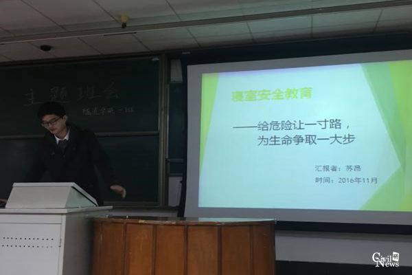 2016年11月19日下午,公司2016级隧道学硕1班在逸夫楼4307a教室举办了主题为“给危险让一寸路,为生命争取一大步”的安全教育主题班会。班会由2016级隧道学硕1班班长苏昂主持,2016级隧道学硕1班全体同学参加。