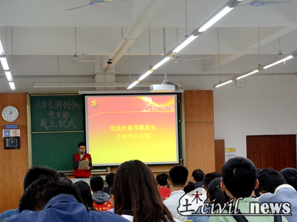 下面,科创中心党员代表邓鹏上台发言并带领全体党员宣誓。邓鹏同学从容走上讲台,讲述了自己在科创的三年所得到的全方面培养和锻炼。他承诺,在以后的日子里,作为一名党员的他将以身作则,积极参加各类活动,让更多同学的能力得到锻炼、思想得到升华。随后,他带领老员工科创中心全体党员宣誓,鼓舞人心的誓词飘扬,铿锵有力的宣誓声在教室中回荡。