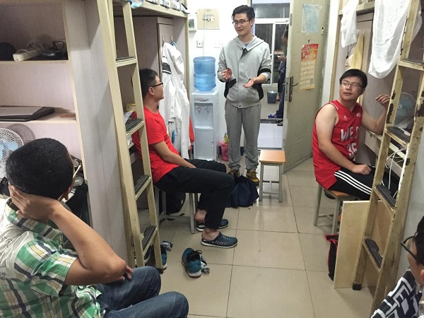 2013级土木12班班长陈锦涛同志率先在T053026寝室为新生详细地讲解了新生所提问的国际班的相关情况,他强调要想以后出国工作,一定要有充分的准备,大学期间要好好学习英语,英语是以后工作的通行证,最好在大学期间将英语四六级过了。他也向新生强烈建议在学习期间一定要认真刻苦,不要迟到早退,课后作业要及时认真完成,能够保研就争取保研,并分析了如今就业形势。