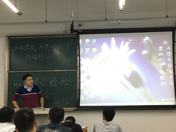 9月24号晚7点30分,土木工程员工党支部策划组织的“教育主题月”系列活动的第三场——班级建设经验分享会在X2428举行。土木员工第二党支部书记吴桐主持了本次交流会,14级土木三班何乃李同学、14级土木二班迟航同学和14级机械四班屈萌同学作为主讲人,为16级学弟学妹们分享自己关于班级和团支部建设的心得体会。