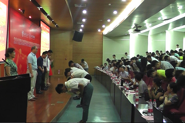 随着老师们的一一登台,同学们也集体起立,向他们最敬爱的老师深深鞠躬。大屏幕上放着一句话:“我们从老师的目光中走远,再见恩师,看鬓角都生着白发。我们无言,唯有深深鞠躬,一如稻谷深深俯首感激抚育它的大地。”