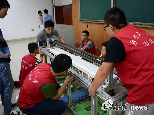 工作人员在紧张的调试加载装置的同时,指导老师们面对着众多桥梁,一个个的仔细观看,就着存在的问题进行点评,在B042小组的镂空桥梁前面站了一会儿,徐老师问了组员们一些问题,为什么要在桥头两边安装两块纸片,当同学们回答说是为了防止桥梁因为承重变形的时候,老师解释道这个是没有必要的,可以试着在没有这两块隔板的情况下加载一次,接着又问道有没有之前去加载一次,同学很抱歉的说没有,老师提议道在正式加载之前可以去加载一次试一试,大概加载心目中质量的30%~40%进行试验,再优化。