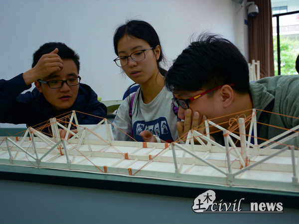 5月7日早上八点,在四号教学楼一楼,由土木学院科创中心举办的“土木科技月”赛事中的桥梁比赛拉开帷幕,预赛如火如荼的展开着,在4154教室里面,罗列着参赛队员们的众多作品。