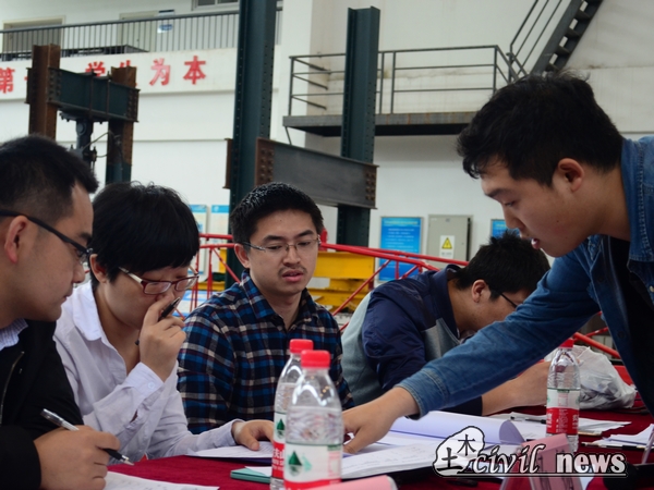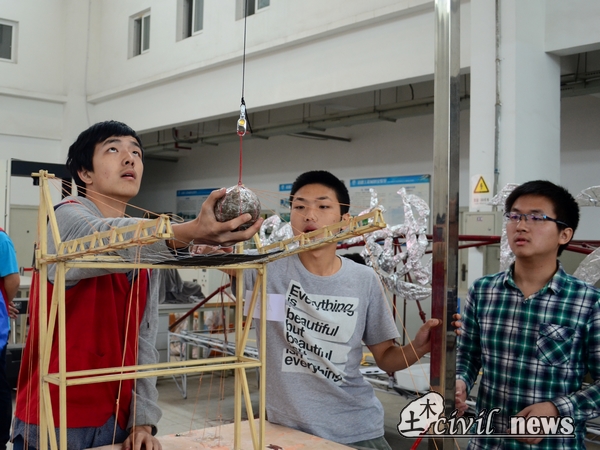 接下来,一组组模型被铁球无情地“蹂躏”,也有的组模型顽强抗争到最后,比赛渐渐白热化。铁球砸下前一秒,选手们都屏气凝神,砸下瞬间,仿佛铁球是砸到自己心里一般悸动。之后兰州交通大学的几位专家突然到场观看比赛,这也讲比赛推入高潮。一番激烈的角逐之后,比赛也接近了尾声,此时,也已将近正午。