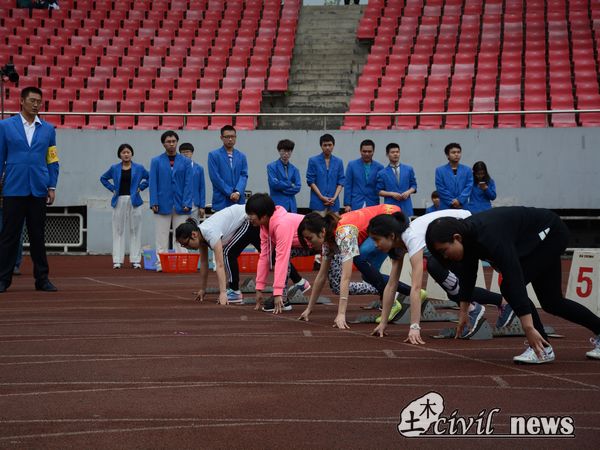 紧接着便是教工组的比赛。首先进行的是教工男子100米比赛,教工运动员走向赛场的那一刻,全场又掀起了一次高潮。接着便是教工女子100米比赛,箭一般的速度昭示着她们的激情。与此同时进行的还有教工男子立定跳远项目、教工男子铅球项目、教工女子立定跳远项目、教工女子铅球项目。看着对自己谆谆训诫的老师和学院领导们,每一位同学都毫不吝惜的送上了自己的掌声。