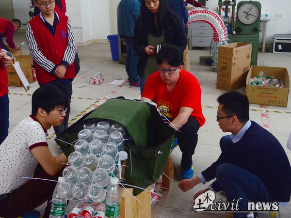 最后,记者就有些选手加载重量为比较小甚至为零的现象采访了李书记。李书记谈到:“有的选手做的模型自重确实很轻,但稳固性不好,组委会也准备了水和沙子来增重加固,这就需要选手们自己的考量和选择;也有的选手对模型拱高估计失误,导致最后加载时很容易触碰到承重物而成绩不佳。”的确,一个好的模型制作不仅需要合理可行的思路,更需要团队之间的默契配合。