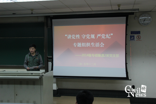 2015年12月16日19:30分,jn江南2014级专硕隧道2班在逸夫馆4218教室开展了“讲党性 守党规 严党纪”专题组织生活会。会议的主要内容是重温《中国共产党章程》,学习《中国共产党廉洁自律准则》(以下简称《准则》)和《中国共产党纪律处分条例》(以下简称《条例》)。会议由党支书欧小强主持。