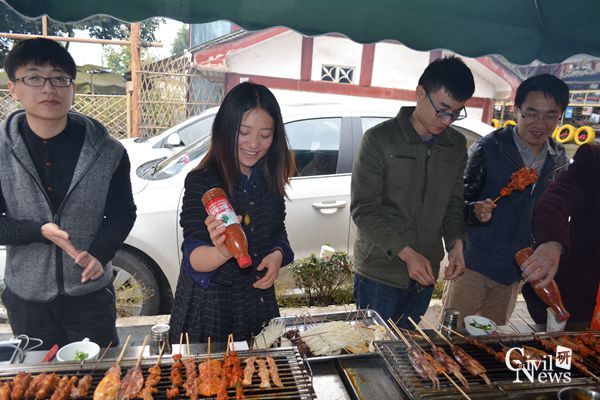 中午十二点,同学们聚在庭院里的烧烤区开始准备午餐。大家纷纷化身烧烤小能手,有模有样地刷蘸料撒调料,一时间,香气四溢。大家一边七手八脚地烧烤,一边大块朵颐,有说有笑,其乐融融。