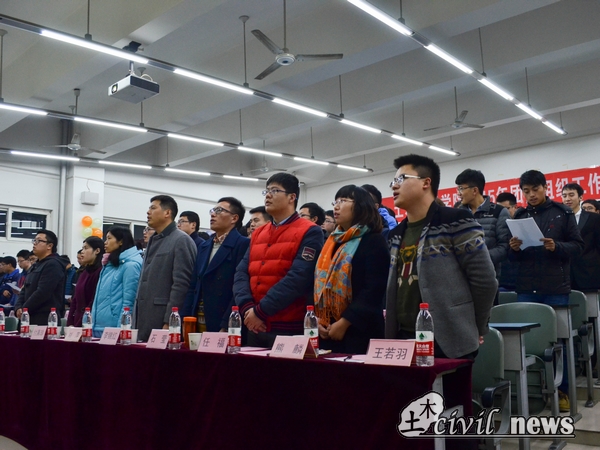 待与会嘉宾及人员都已就座后,主持人宣布大会正式开始。首先,主持人简明地向与会嘉宾们介绍了2015年度本学院团委的工作要点,并向这一年来尽心尽力工作,并取得优秀成绩的各团学组织表示由衷的祝贺。接着,全体成员起立,奏唱团歌《五月的花海》。整齐嘹亮的歌声回荡在整间教室,传达出了大家对自己组织的那份责任感与热爱之情。