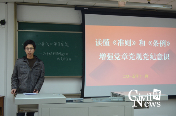 首先,党支书朱元奇同学介绍了《准则》的“五大亮点”和“四个必须”。《中国共产党廉洁自律准则》,是党执政以来第一部坚持正面倡导、面向全体党员的规范全党廉洁自律工作的重要基础性法规。其“五大亮点”表现为:去除与廉洁自律无直接关系的条文;坚持正面倡导;面向全体党员;删繁就简;删繁就简。“四个必须”为:必须坚定共产主义思想和中国特色社会主义信念;必须坚持全心全意为人民服务根本宗旨;必须继承发扬党的优良传统和作风;必须继承发扬党的优良传统和作风。朱元奇同学对在座的党员讲到:“我们部分同学将来有可能会走向仕途,我们有必要从现在做起,培养良好的生活作风。”