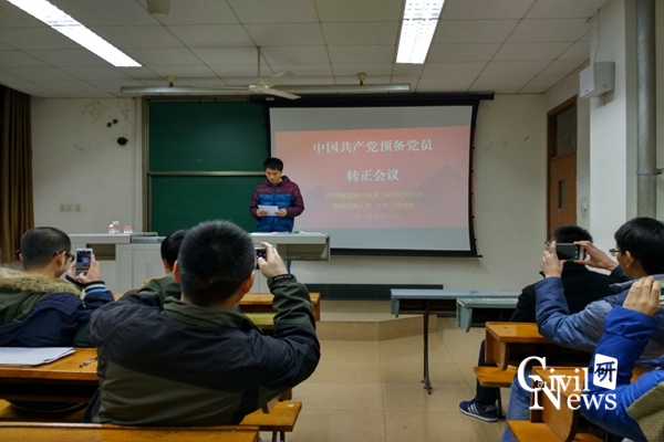2015年12月14日19:30,2013级道路与铁道工程2班党支部在九里校区逸夫馆4419召开党支部活动暨预备党员转正大会。本次党支部活动主要内容为深化学习、贯彻《中国共产党廉洁自律准则》(以下简称《准则》)和《中国共产党纪律处分条例》(以下简称《条例》)。同时,本支部预备党员转正大会同期召开。