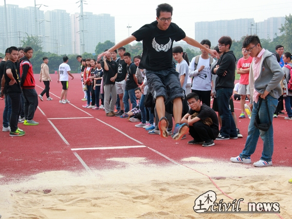 径赛激荡人心,田赛也同样让人心潮澎湃。男子女子跳远比赛也在紧张的进行着。助跑,起跳,腾空,落地。一道道优美的弧线,完美诠释了运动本身的美。在每一个同学比赛过后,工作人员测量与平沙的工作井然有序的进行着,不仅提高了效率,同时在上演着交大人的团结精神。