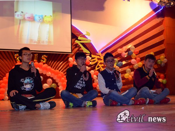 045031的大男孩们则呈现出男生独有的情怀。理想,勤奋,insist、bravery、companion是他们的代名词。在《同桌的你》的背景音乐中,他们生活的点点滴滴缓缓铺开:军训、班级篮球赛、外出聚餐、风采大赛的初赛——“connecting the dots,and draw a beautiful curve.”才艺表演中,一曲《我的好兄弟》诠释浓浓兄弟情。今晚恰好是寝室长的生日,全场观众应邀合唱了《生日快乐歌》,一时间气氛活跃,场面温暖。