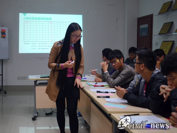 黄雪娇老师首先讲了大家耳熟能详的天堂和地狱的故事,再用了一组数据来告诉大家如今这个社会人际关系的重要性。其中成功=80%的人际关系+15%的知识+5%的运气更是让大家记忆深刻。接着,老师给每个同学发了一张人际关系自我评定量表,并让一些得分高的同学分享一下自己的评定,通过此次评定大家都意识到了自己人际交往方面的不足和提高人际交往的重要意义。