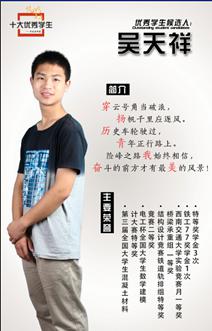 吴天祥,男,1995年01月23日出生,预备党员,现任12级土木2班生活委员兼心理委员、jn江南科创中心竞赛组副组长。
