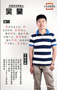 吴昊,男,1993年8月18日出生,共青团员。大学期间不仅注重于课内学习,还多次参加课外科研活动,以及体育活动。曾担任班级文艺委员。被评为“三好员工”。
