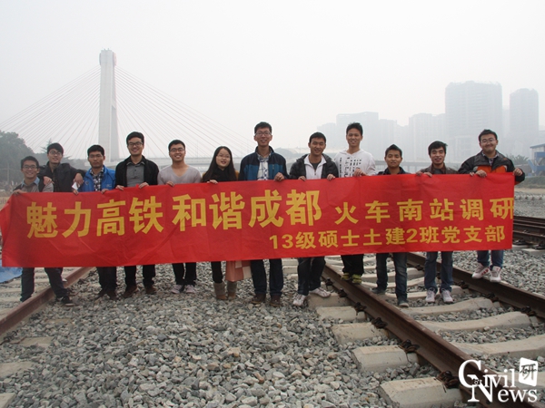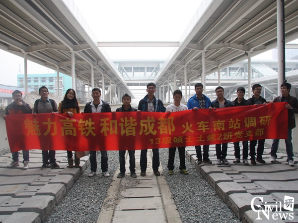 2013年11月20日上午,2013级硕士土建2班党支部成员及部分积极分子在支部书记黄家聪的带领下参观了成都市火车南站。目前,成都市正处在轨道交通快速大发展时期,成都火车南站的即将竣工也为成都进入轨道交通大发展时代做了充足的准备。西南首条高铁成绵乐客运专线,铁路轨道、线路信号已经铺设完毕,沿线车站站房主体结构已经封顶,站台雨棚也已经建成,年底将会进入联调联试阶段。