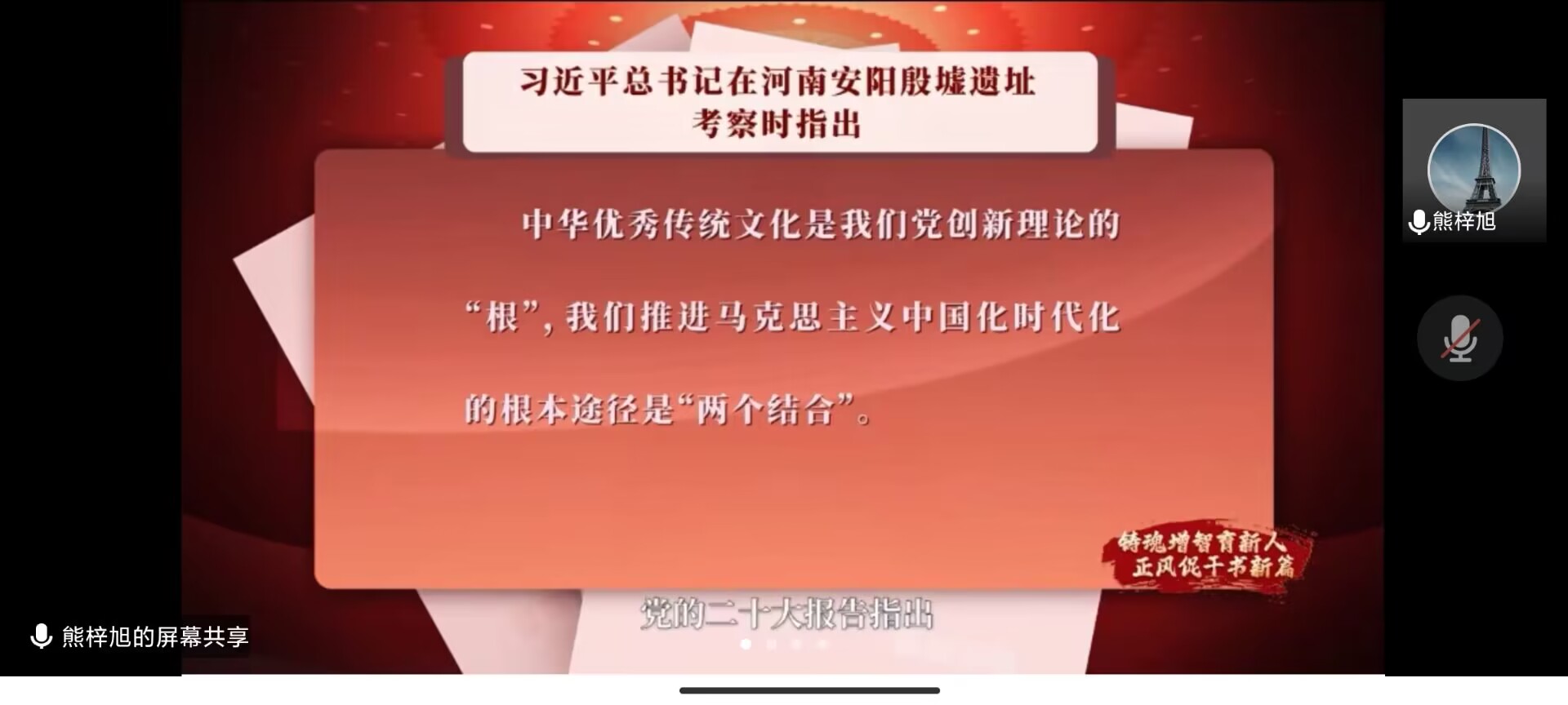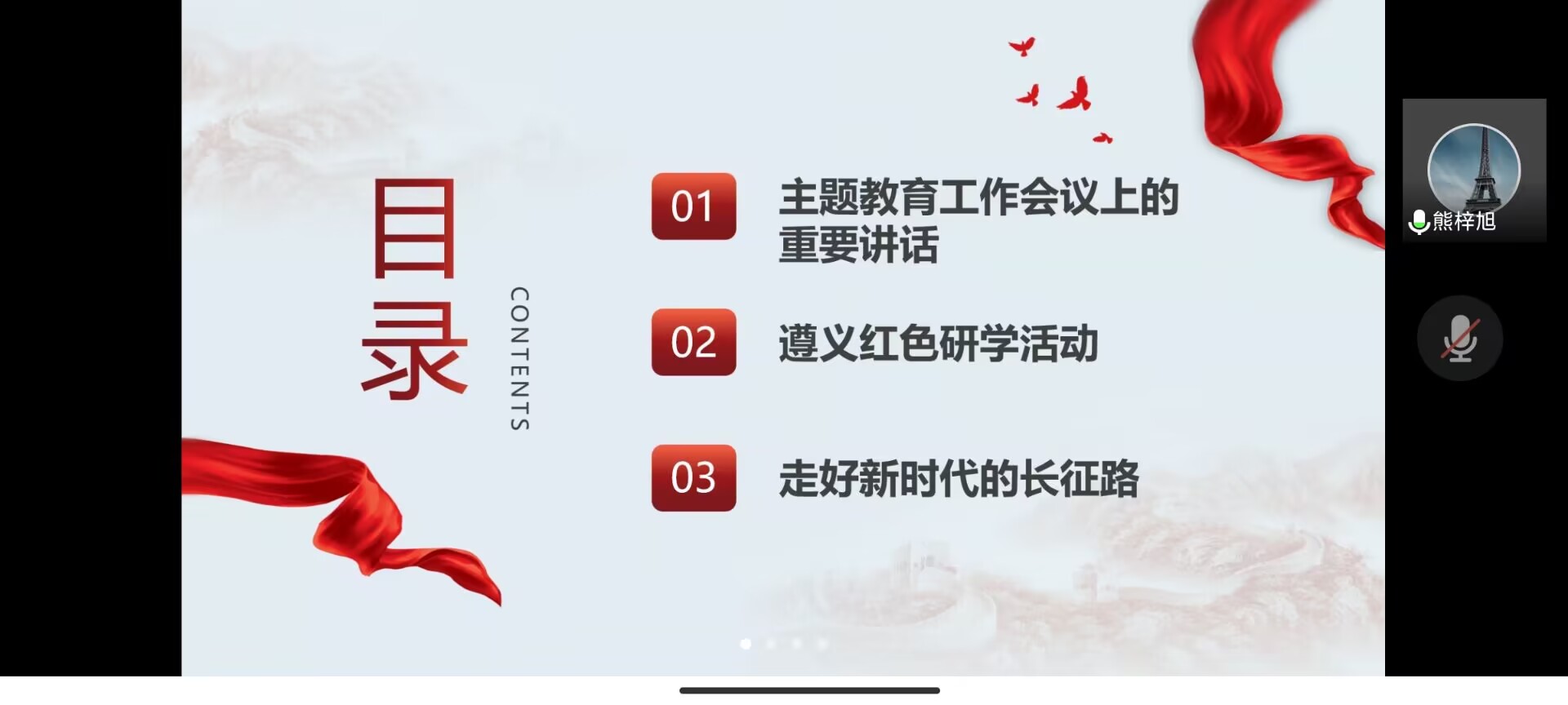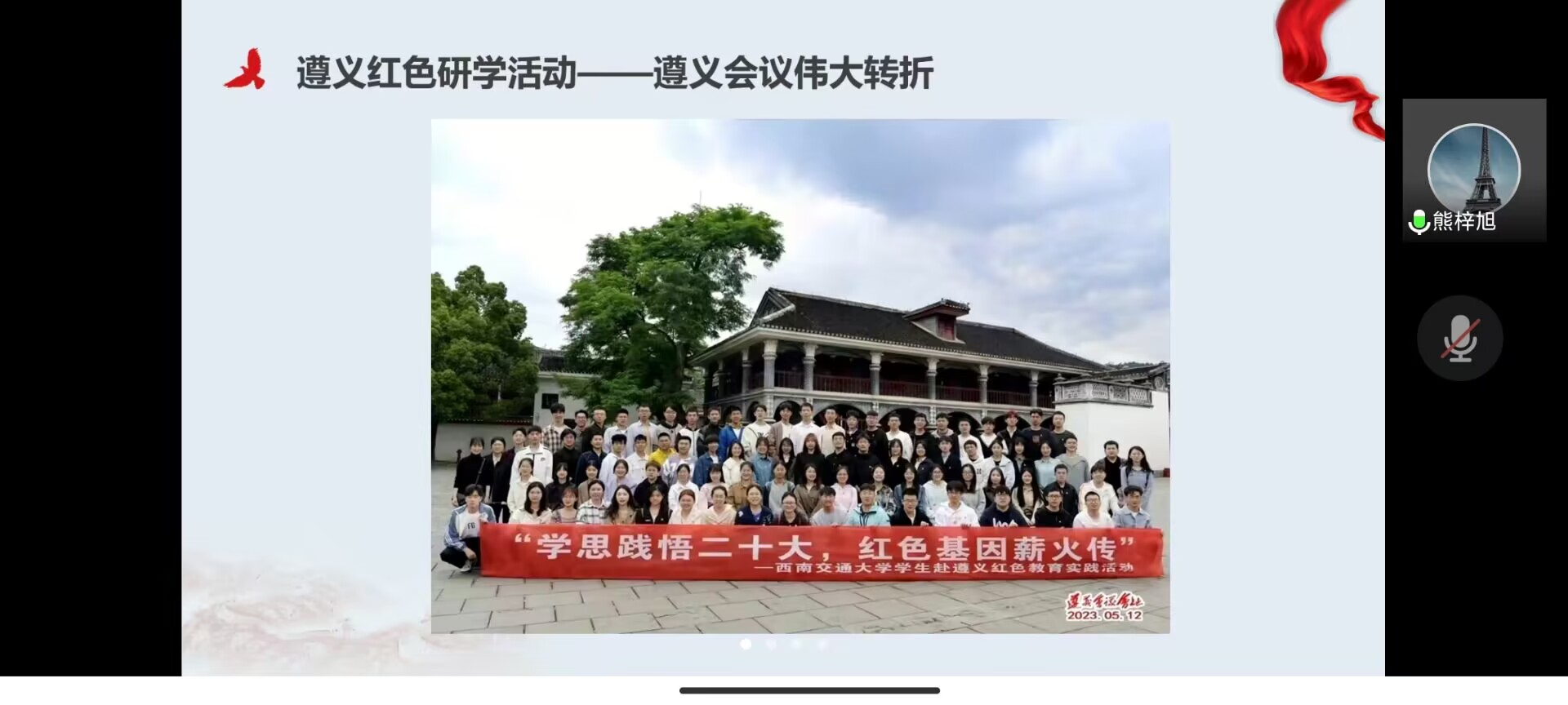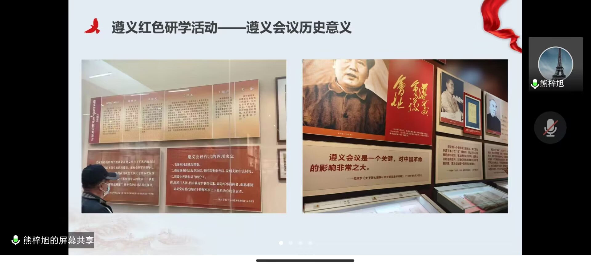 会上,熊梓旭同志通过分享自己去研学的经历,开展了“学思践悟二十大,红色基因薪火传”赴遵义研学活动学习体会的分享活动。讲述了遵义这个转折之城的重要性和打破新生的重要意义。