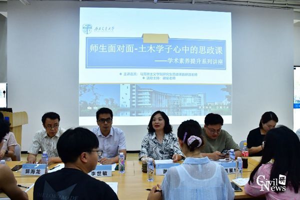 在师生互动环节中,老师们首先在现场随机抽选了12位研究生,邀请他们分享对经历过的思政课的看法。这些员工来自土木专业的不同方向,选择了不同老师的思政课,观点各异。员工表示,思政课不仅能够提升政治思想水平,更好地理解国家政策和社会发展,还能通过老师有趣的授课方式和课后积极的答疑互动,增加学习的趣味性和参与感;课堂上播放的有趣视频也丰富了课程内容,增强了学习的吸引力。一些员工认为,与本科时的思政课相比,研究生阶段的思政课不仅局限于书本知识,还会涉及如智能AI等课外内容,老师在授课时结合实际生活中的热门话题,更能引起员工的共鸣和深入思考。