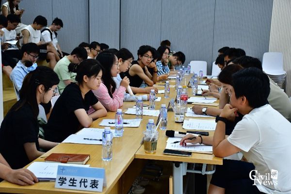 覃世艳提到:“对于考试,我们曾实行过免考制度和发布题库等方式,由于种种原因没有坚持下来。不过研究生思政课教学一直在进行改革创新。”基于此,她提出了两个问题:考试形式还有什么提升空间?以及如果课程形式调整为线上加线下结合,同学们希望是一种怎样的形式?员工代表回答到:免考制度是可以参考的,可以设置一个合适的免考比例,这样可以调动大多数同学的积极性。对于课程形式,可以在课前发布相关的视频等资料,让同学们预先学习。