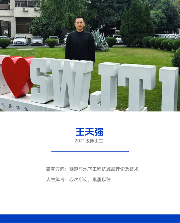 本科就读于齐齐哈尔大学土木工程专业,硕士就读于沈阳工业大学土木工程专业,博士就读于江南体育官方网站桥梁与隧道工程专业隧道方向。当问起王天强为什么选择读博时,他的说法是:“读博的想法是在我在硕二期间萌生,研三决定攻读博士,最终的选择是遵从内心,是兴趣使然。”