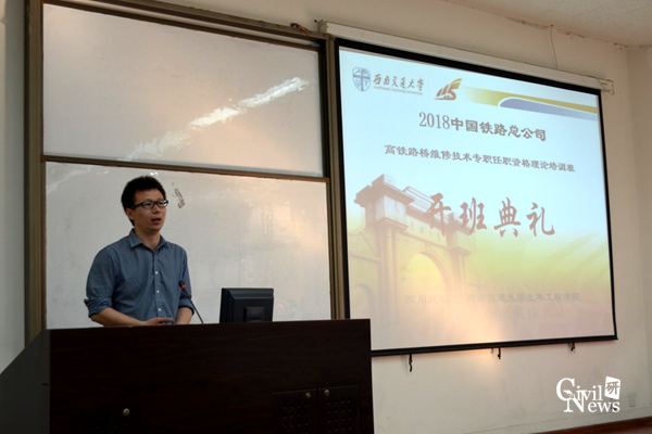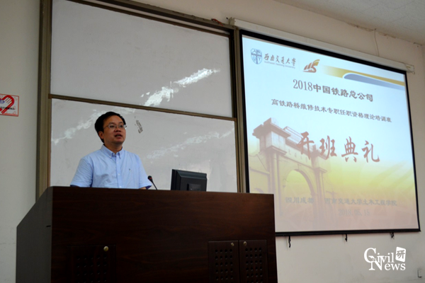 典礼上,占玉林老师首先进行了致辞。他对来自中国铁路总公司的各位学员表示了热烈欢迎,并强调,“我们将充分利用公司的高水平团队队伍及优势学科平台,争取让每位学员能有所收获,从而不辜负中国铁路总公司对公司的信任”。在致辞的最后,他也预祝学员们通过这期培训班能学有所成,度过一段愉快而充实的时光。