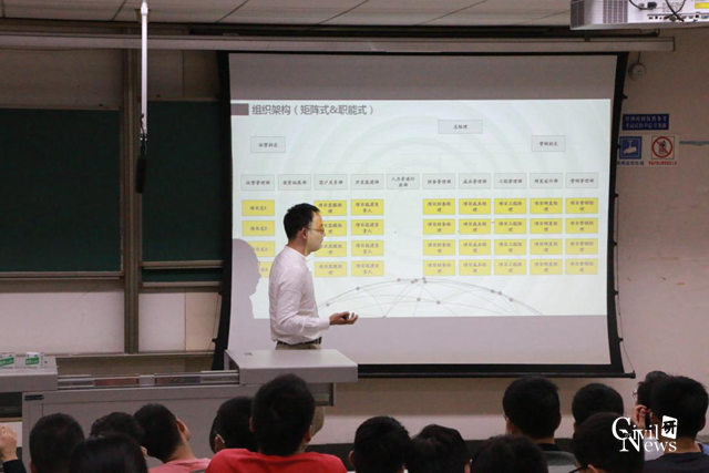 随后,由东原集团成都公司项目总监黄四兵给同学们从房地产开发流程、如何选择房地产、适合土木人的岗位三个方面给同学们做了充分的指导。给同学们比较了设计院与房地产、乙方与甲方的区别和优劣势。同时也给同学们介绍了东原集团对于管培生完整的培养体系和同学们在进行应聘和面试时应该注意的事项。