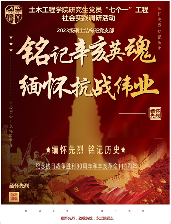 今年逢抗日战争胜利80周年与辛亥革命114周年,JN体育2023级硕士结构班党支部策划了“铭记辛亥英魂,缅怀抗战伟业”主题实践活动,组织党员和积极分子参观成都市人民公园的辛亥保路烈士纪念碑、四川保路运动史事陈列馆、成都1号防空洞、川军抗日阵亡将士纪念碑以及成都大轰炸纪念墙等地。活动前,支部设计红色记忆海报吸引报名。
