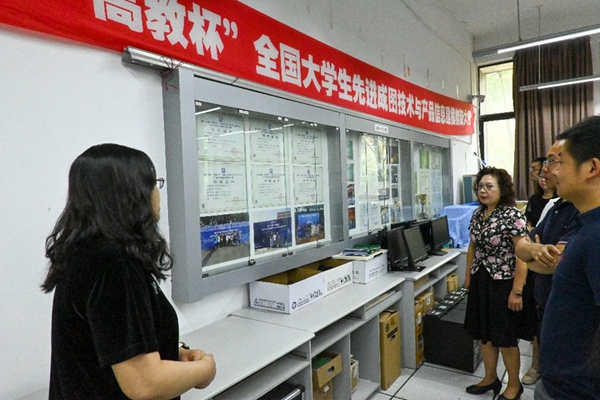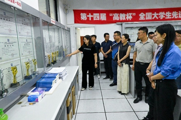 汇报完成后,支部书记赵莉香带领学院领导和各系室支部书记参观图学及BIM研究所主要负责指导的竞赛获奖成果展示橱窗。橱窗展示了多项团体国家级一等奖及个人全能国家级一等奖奖状及奖杯等荣誉。