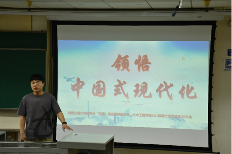 随后,“红路”学讲团成员童心豪、叶文龙两位博士以“强国建设、民族复兴的康庄大道—中国式现代化”为题为同学们展开讲解。童心豪博士详细介绍了我国的大国工程,从中国载人航天到拉萨-林芝铁路到三峡水利工程到世界奇迹港珠澳大桥到中国天眼,中国一步一步走出了一条具有中国特色的自主创新之路,加快建设科技强国,实现高水平科技自立自强。