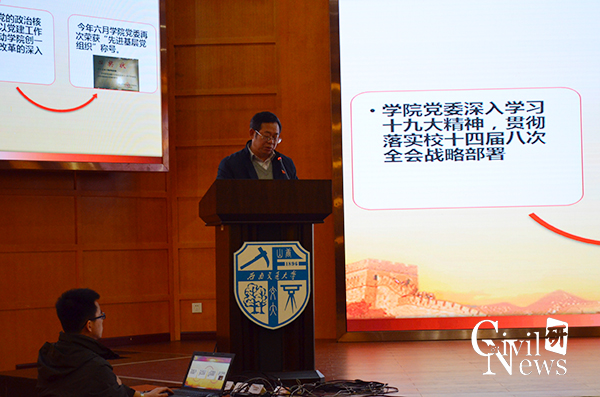 首先,刘学毅书记做了以学习贯彻十九大精神、对标“双一流”建设目标以及以党建一流推动学院改革发展为主题的2017年土木工程公司党建工作总结。他说,为了切实加强高校思想政治工作,巩固意识形态阵地,学院基层党组织一年来做了许多实质性工作并取得了丰硕的成果。在十九大精神引领下推进“两学一做”常态化制度化,规范做好基层党建的日常工作。同时,刘书记也分析了当前党委工作开展中存在的不足和问题,提出了未来工作努力方向。