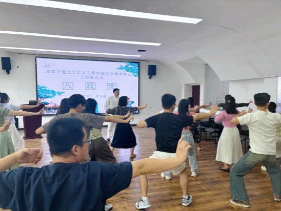 随后,协会会长王楠老师介绍了协会第一次活动——八段锦工间操,八段锦功法是我国经典的传统养生功法之一,注重身心合一,有着丰富的历史内涵和文化底蕴。通过学练八段锦,达到祛病健身,提升教职工工作效率和健康状态。协会邀请了土木工程公司谭力豪老师担任总教练,谭力豪老师主攻民族传统体育方向,曾荣获四川省高校健身气功比赛八段锦普及功法第一名。