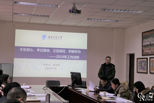 12月27日下午两点,土木学院在九里校区1324会议室召开学院助理及科职干部年度述职考核会。公司党委书记刘学毅、经理蒲黔辉、中层副职领导及公司党委委员作为评委参加了考核会议,学院共11位(含峨眉土建系)助理、科职干部进行了述职考核。