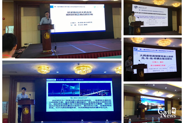 在23日下午的大会分组报告,五位博士生吴金峰、宋立忠、王党雄、梁林、杨琪分别作了题为“大跨桥梁桥塔对移动列车气动特性影响的风洞试验研究”、“基于波导有限元和二维边界元的城市轨道交通刚构箱梁声振特性分析”、“中低速磁浮列车-桥梁系统竖向耦合振动理论分析与试验验证”、“减振垫浮置板用于大跨度钢桁梁斜拉桥的减振降噪研究”和“一种盾构隧道壁后注浆隔震层材料试验研究”的大会分组学术报告;同时,团队的五位硕士生杨得海、张泽田、高慰、唐庆、郭镇分别作了题为“大跨度铁路斜拉桥桥塔地震损伤演化”、“桥梁墩高对大跨连续刚构桥地震响应的影响”、“列车运行对高铁站房振动噪声影响的试验研究”、“大跨度铁路钢管混凝土拱桥风-车-线-桥耦合振动研究”和“桥梁截面形式对轨道交通高架线路综合噪声影响研究”的大会分组学术报告。