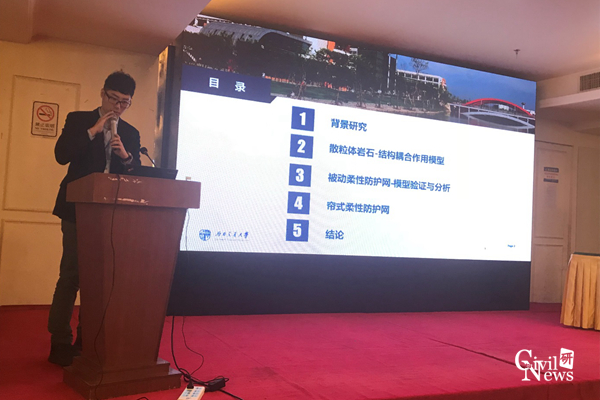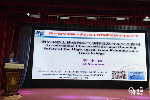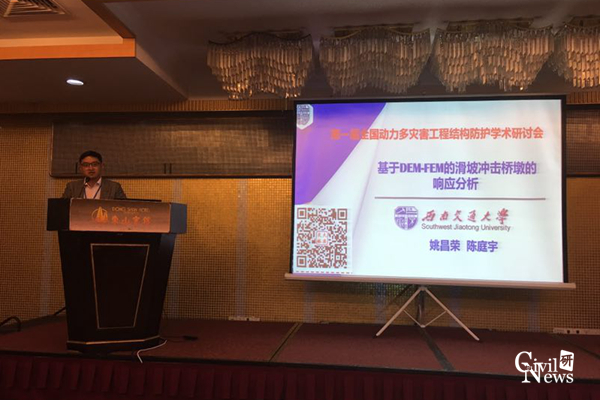 23日上午的大会主题报告,李小珍教授受邀作了“钢桁梁桥上移动高速列车气动特性的风洞试验与行车安全控制”的特邀大会主题报告(图4),主要探讨了钢桁梁桥上高速移动列车的气动特性试验研究及行车安全控制;姚昌荣副教授作了题为“基于DEM-FEM方法的滑坡冲击桥墩的动力响应分析”的大会分组学术报告(图5);许浒老师作了题为“基于爆炸模拟的柔性防护网系统多体冲击力学响应及分析”的大会分组学术报告(图6)。