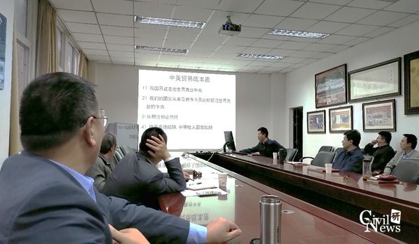 活动第四部分由李永乐教授给大家分享了《发挥体制优势、积极应对中美贸易战,暨对学科发展的思考》的主题学习。李永乐教授深入剖析了中美贸易战中间的核心问题,从学科发展的角度提出了新颖的应对思路,让与会同志们耳目一新。